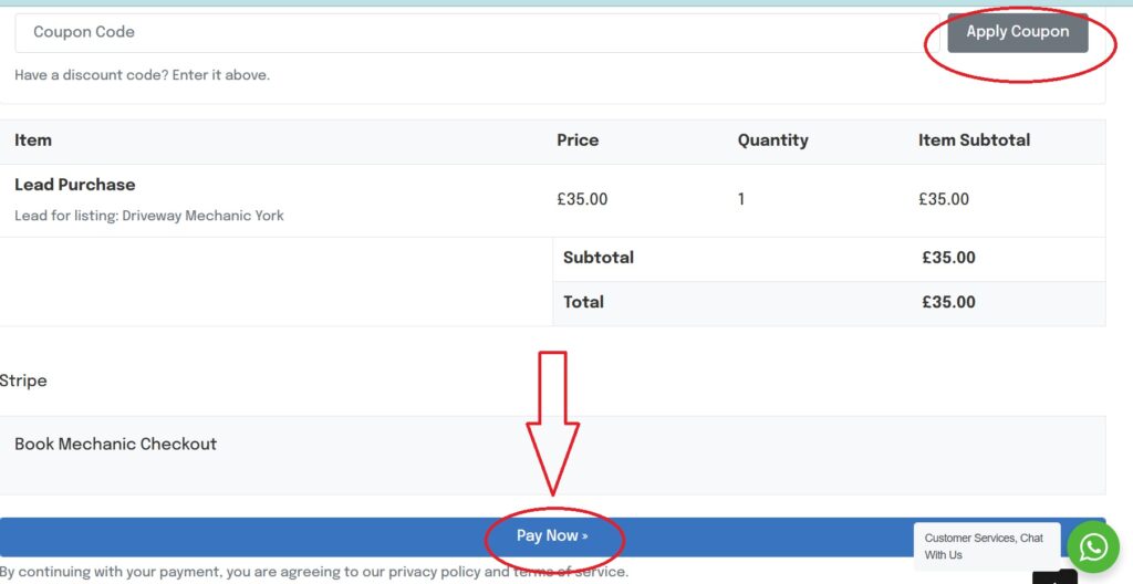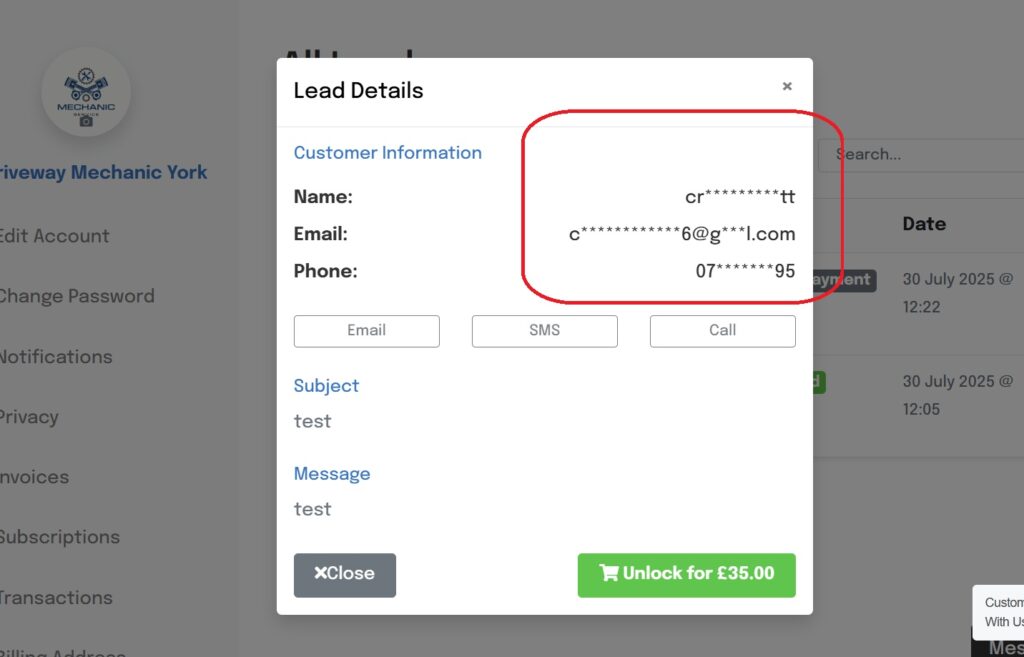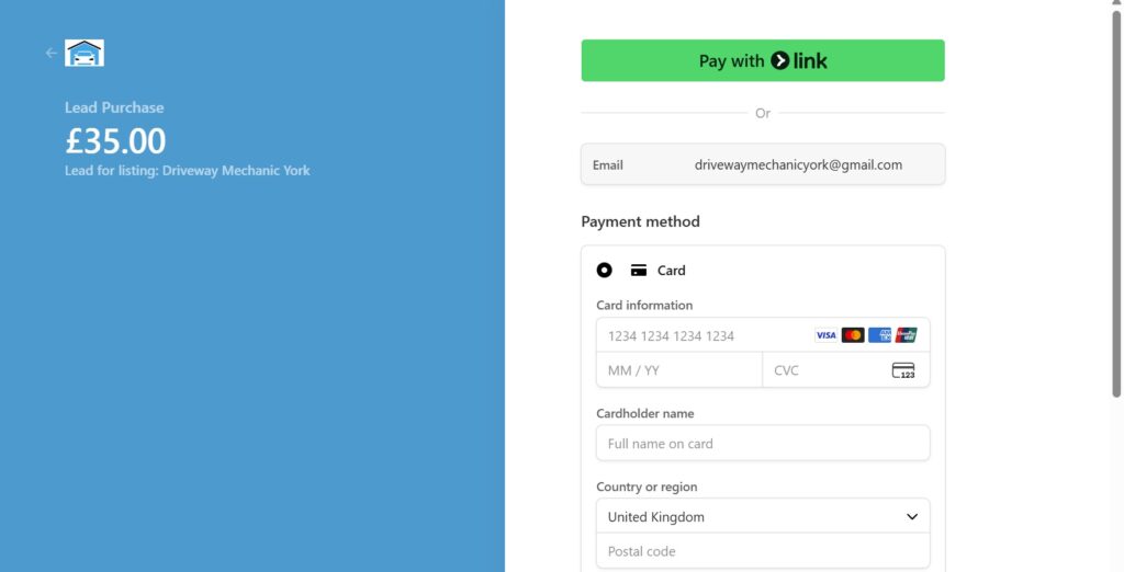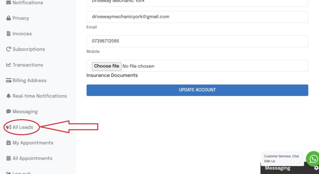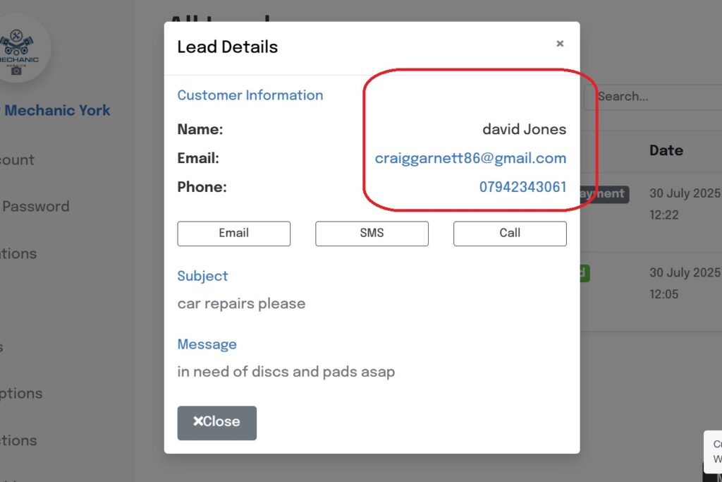 • Depending on your subscription level depends on the charge for each lead / cost for lead generation in your area. The top package lead generation form is normally Free with the subscription and some of the lower packages have a small charge working up-to pay as you-go for Free Mechanic Listings. example: Tip – Some area representatives may have access to a discount code!!