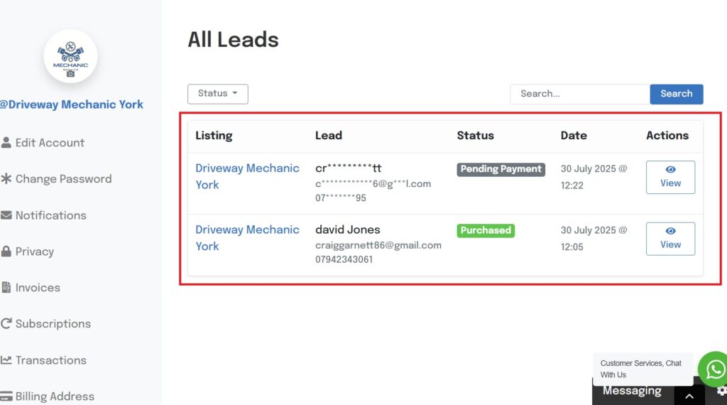 • Your “leads” will appear in the box below and will allow you at accept and access customers enquires. Click on “View” next to the lead you want to view.