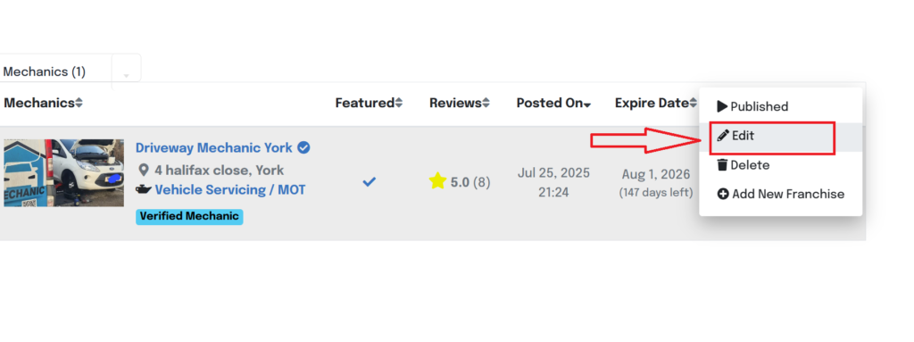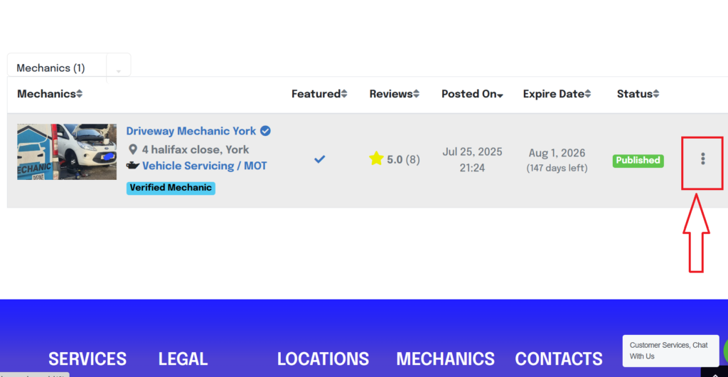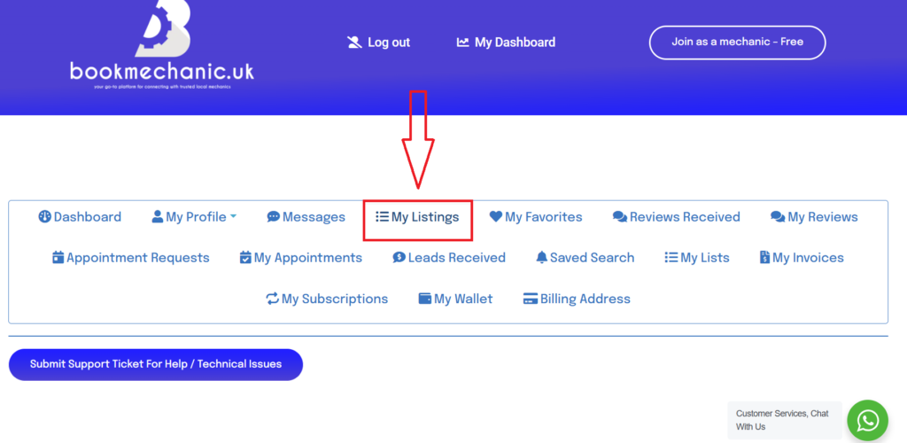 • You will be directed to your mechanics dashboard. Select the “My listings” tab.