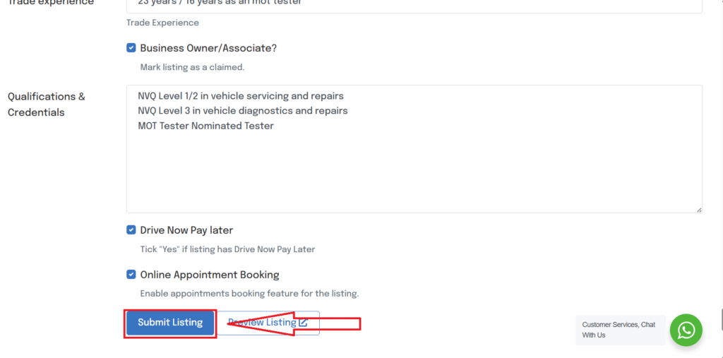 • Select “Submit Listing” once completed and this will set your edits live. Some edits can take up-to 48hr to show.