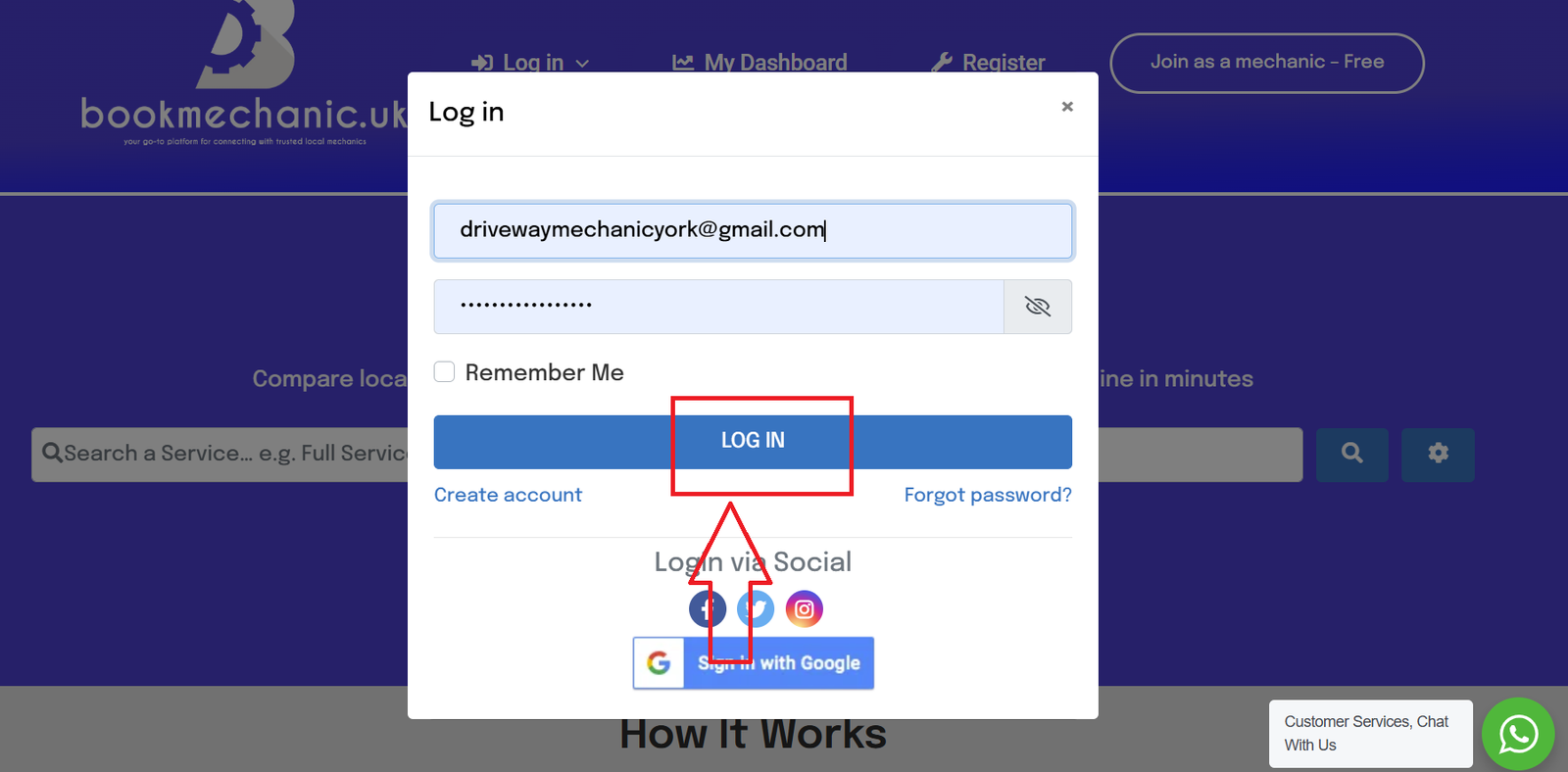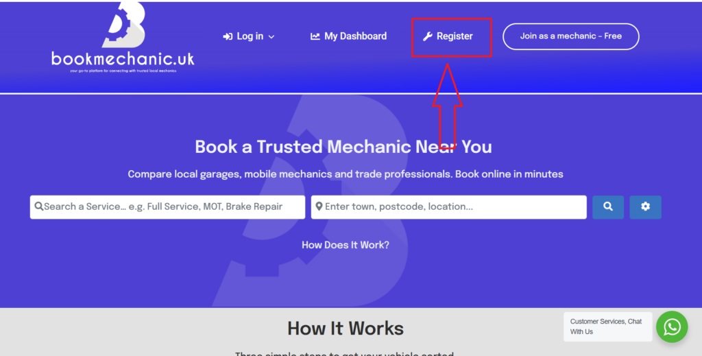 • To register an account with bookmechanic.uk. Head to the top of the page next “Log In” click on “Register”