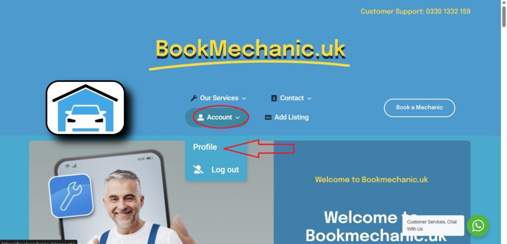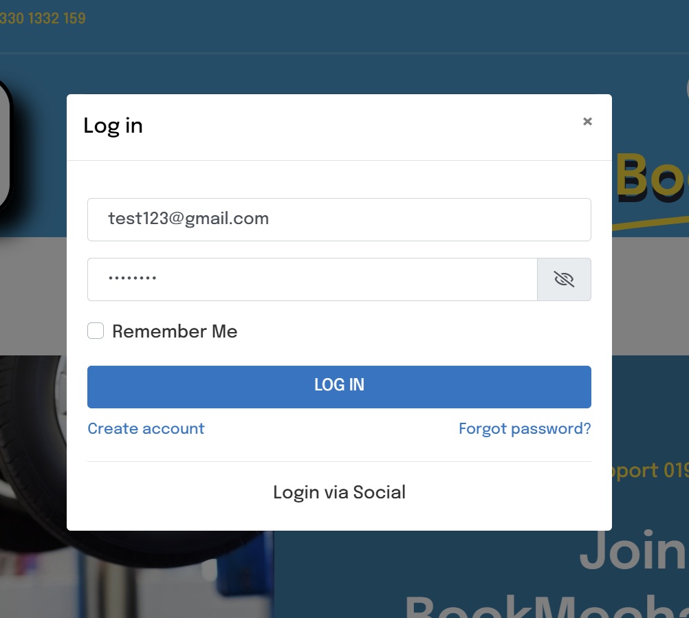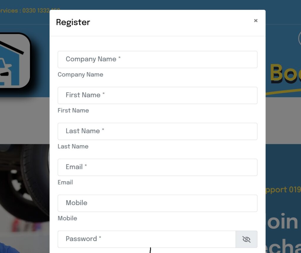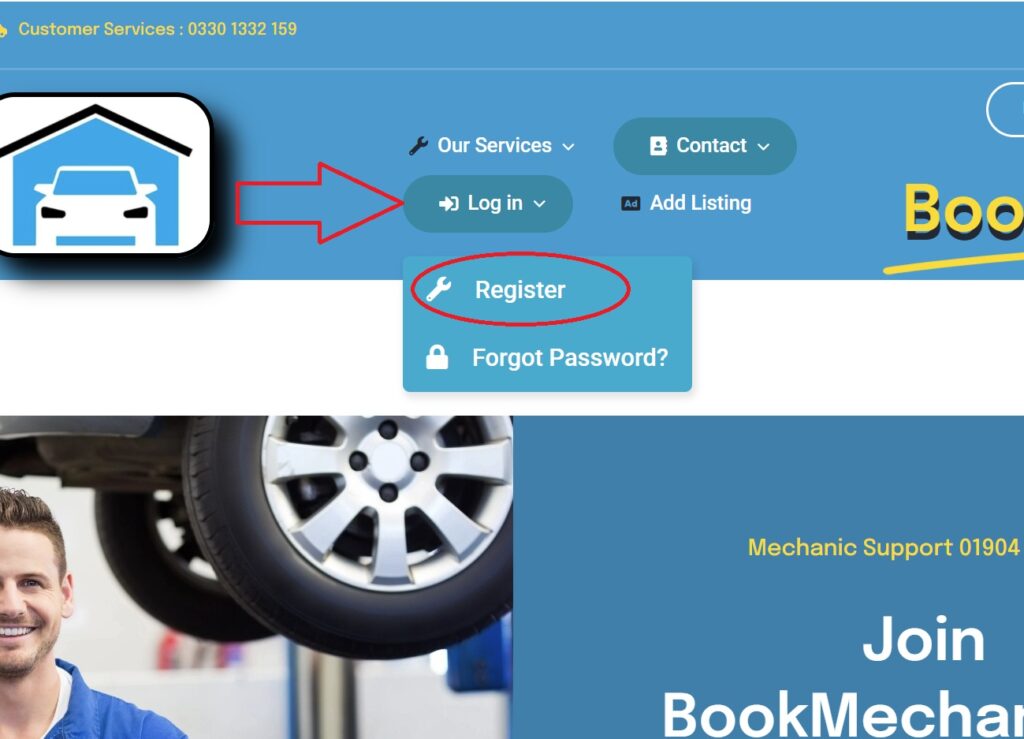 To register an account with bookmechanic.uk is free. Head to the top of the page and in the drop down menu “Log In” click on “Register”
