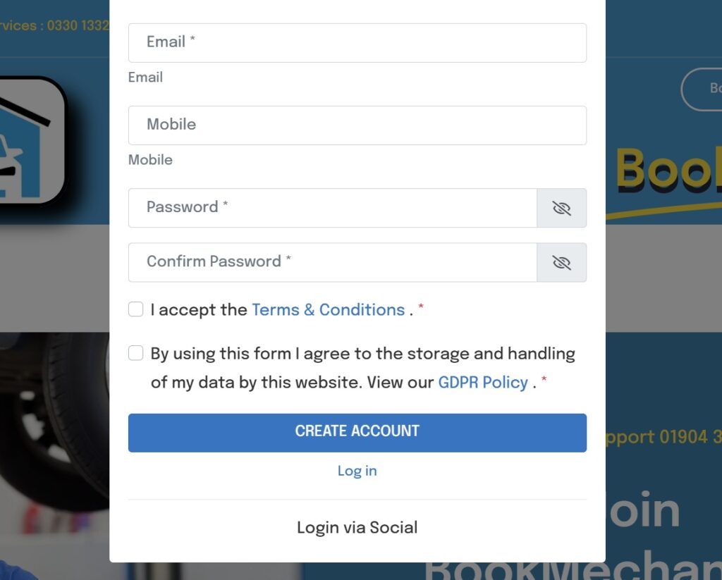 A resister form will appear in the form of a light box, complete all details and accept and view the terms and conditions / GDPR Policy then click “Create Account”