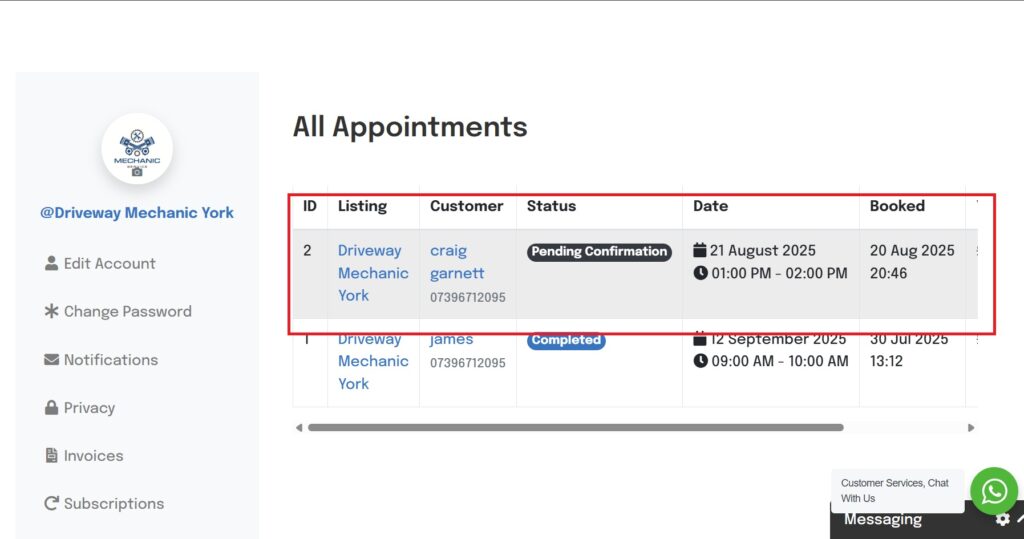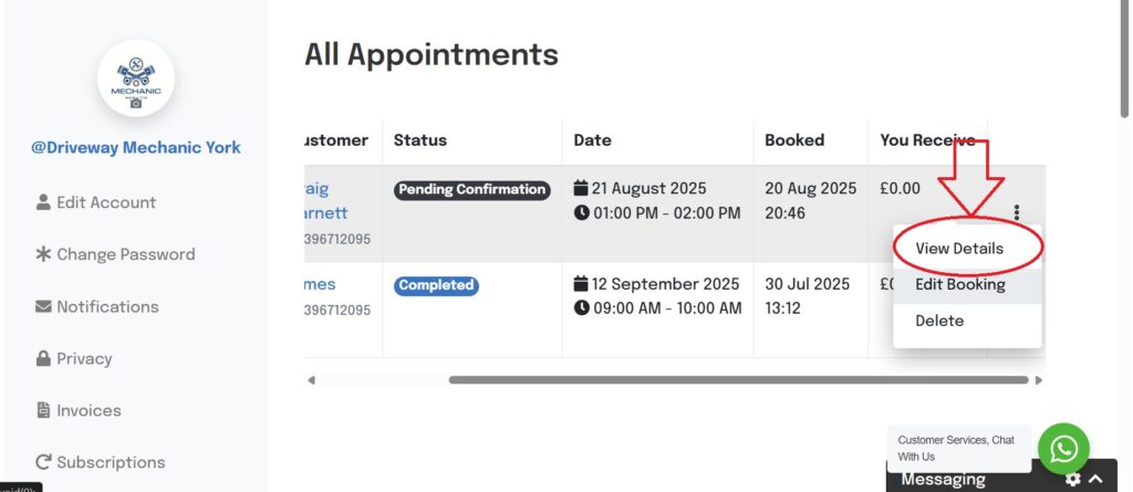 If you head over to your account page and select “All Appointments” this will let you view all bookings made through your listing. Account > All Appointments