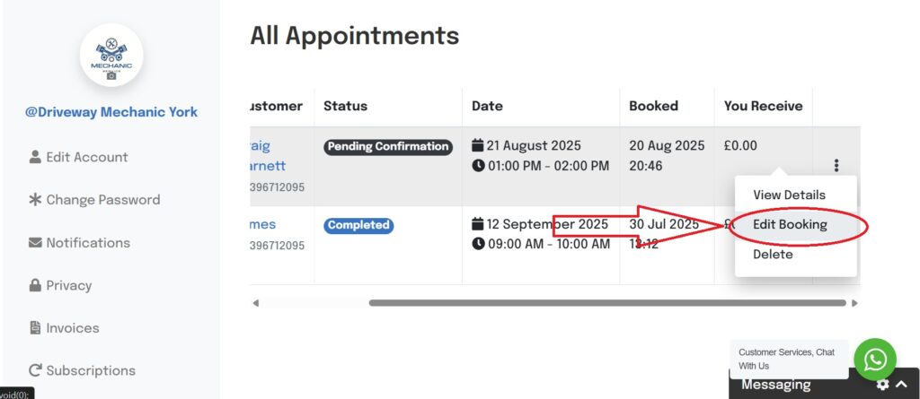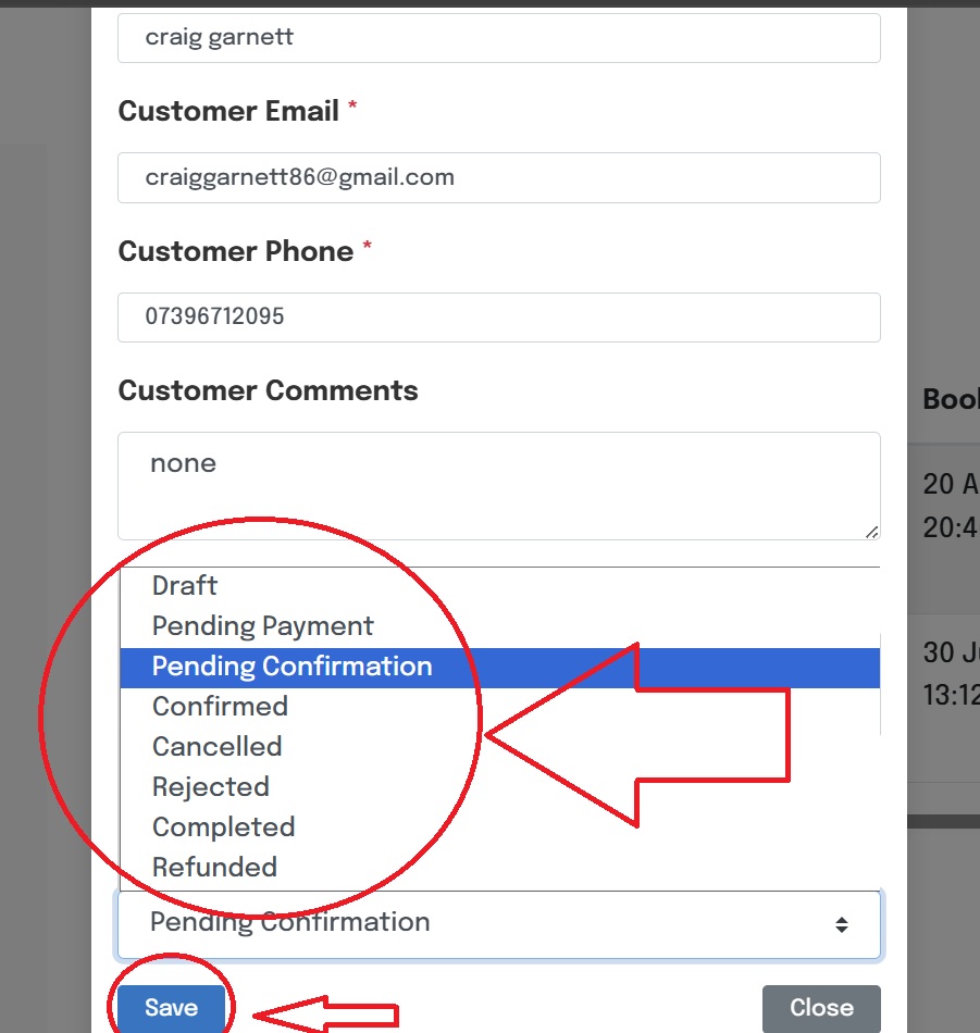 This section you can adjust appointment details and mark the booking as one of the available options below. it is important this is updated and marked as completed , pending , cancelled or any of the options as the book mechanic system will continue to send them emails until its updated. Then select “Save”