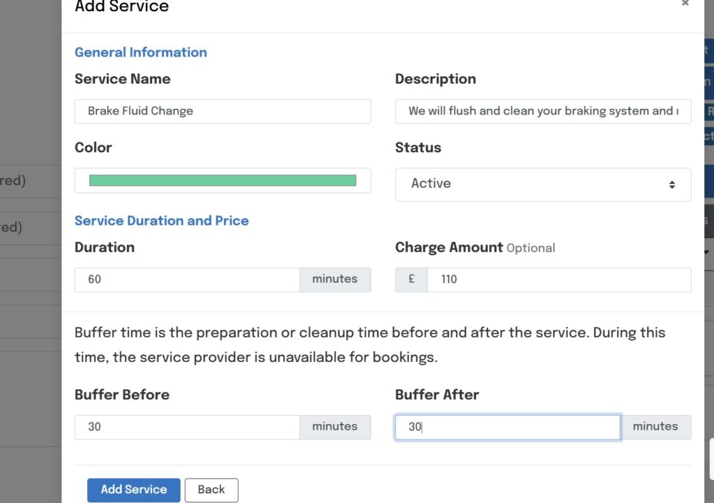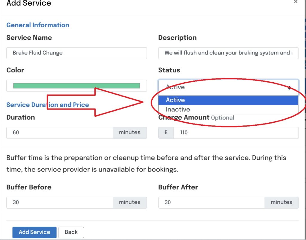 Status – Active/Inactive, mark the service as active to allow bookings or Inactive to make the service un-bookable