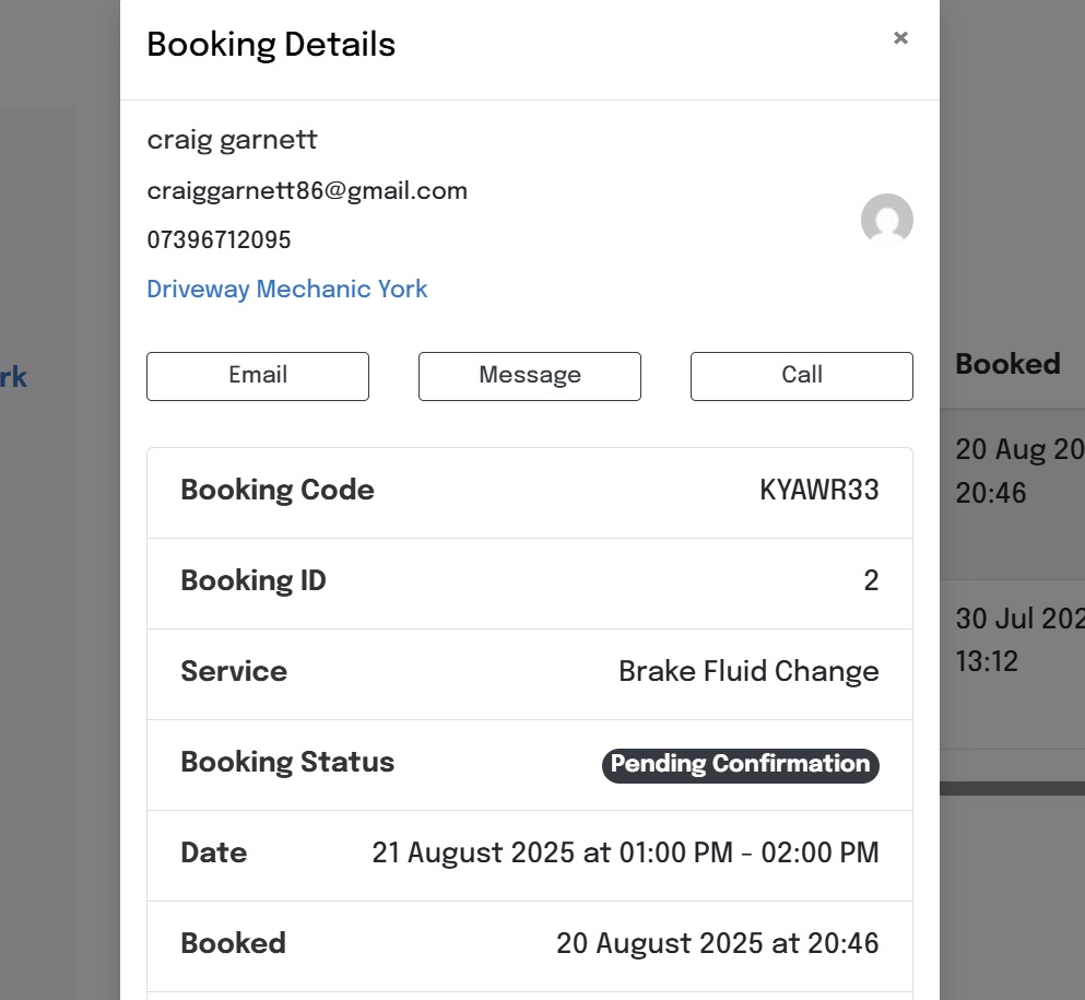 This will open a light box with all the information selected in the booking tile section. These bookings are not set in stone and is up to the mechanic / garage to contact the customer to confirm / adjust any bookings. Edits can be made in the next section.